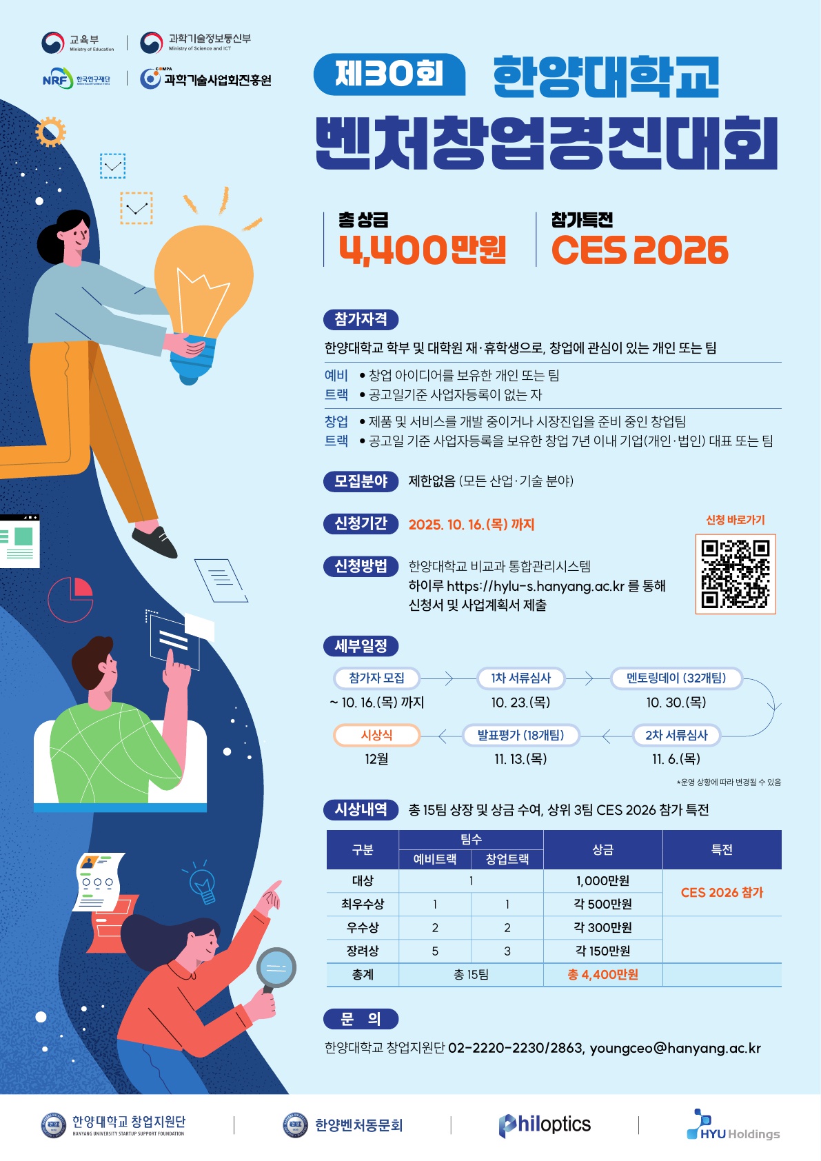 창업지원단에서 대학(원)생들의 혁신적인 아이디어 발굴과 창업 역량 강화를 위해 "제30회 벤처창업경진대회"를 개최하게 되었습니다. ■ 참가자격 (공통) - 한양대학교 학부 및 대학원 재·휴학생으로, 창업에 관심이 있는 개인 또는 팀 - 대표는 반드시 한양대학교(서울, 에리카캠퍼스) 학부 및 대학원 재·휴학생인 자 - 팀원은 타대생 재·휴학생 가능 (예비트랙) - 창업 아이디어를 보유한 개인 또는 팀 - 대표 및 팀원 모두 공고일(2025.9.9.포함) 기준 사업자 등록이 없는 예비창업자 (창업트랙) - 제품 및 서비스를 개발 중이거나 시장진입을 준비 중인 개인 또는 팀 - 대표는 공고일(2025.9.9.포함) 기준 본인 명의의 사업자등록을 보유하고 있으며, 창업 7년 이내인 자 ■ 모집분야: 제한없음 (전 산업·기술 분야) ■ 모집기간: 2025. 10. 16.(목) 까지 ■ 신청방법 - 한양대학교 비교과 통합관리시스템 하이루를 통해 신청서 및 사업계획서 등 제출 - 신청링크: https://hylu-s.hanyang.ac.kr/ko/program/all/view/2340 ■ 세부일정 - 참가자 모집 1차 서류평가(10.23.(목)) > 멘토링데이(10.30.(목)) > 2차 서류평가(11.6.(목)) > 최종 발표평가(11.13.(목)) > 시상식(12월) - 상기 일정은 운영 상황에 따라 일부 변경될 수 있습니다. ■ 시상내역 - 총 15팀 선정, 상장 및 상금(총 4,400만원) 수여 - 참가 특전: CES 2026 참가 ■ 주최: 한양대학교 창업지원단 ■ 후원: 한양벤처동문회, (주)필옵틱스, 한양대학교 기술지주회사(주) ■ 문의: 02-2220-2230/ 2863, youngceo@hanyang.ac.kr 관련 상세 내용은 첨부된 안내문 및 포스터를 참고하여 주시기 바리며, 학생들이 경진대회를 통해 창업 역량을 키우고 도전할 수 있도록 많은 협조 부탁드립니다.